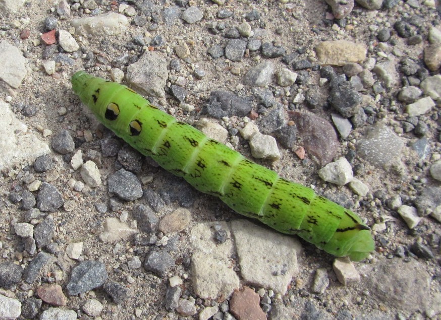 It is an Elephant Hawk-moth caterpillar. Notice the ‘eye’ spots towards its front end. When these caterpillars feel threatened, they rear up at the front and due to the ‘eyes’ are sometimes mistaken for small snakes. It is believed that birds that feed on caterpillars are wary of them when they rear up, and tend to leave them alone.
