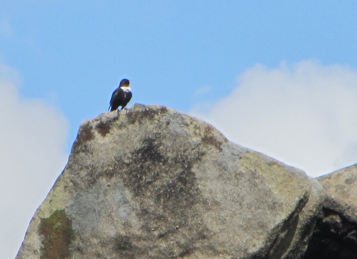 On our walk yesterday on Derwent Edge we were lucky enough to see Ring Ouzels. These rare birds spend the winter in the Mediterranean and North Africa, then migrate to the UK in the spring where they nest among craggy outcrops of rocks and among heather between April and July. The gritstone crags of the Dark Peak are ideal nesting habitats. Their numbers have rapidly declined over the last 50 years and it is believed that now only around 6,000 – 7,000 breeding pairs come to the UK.